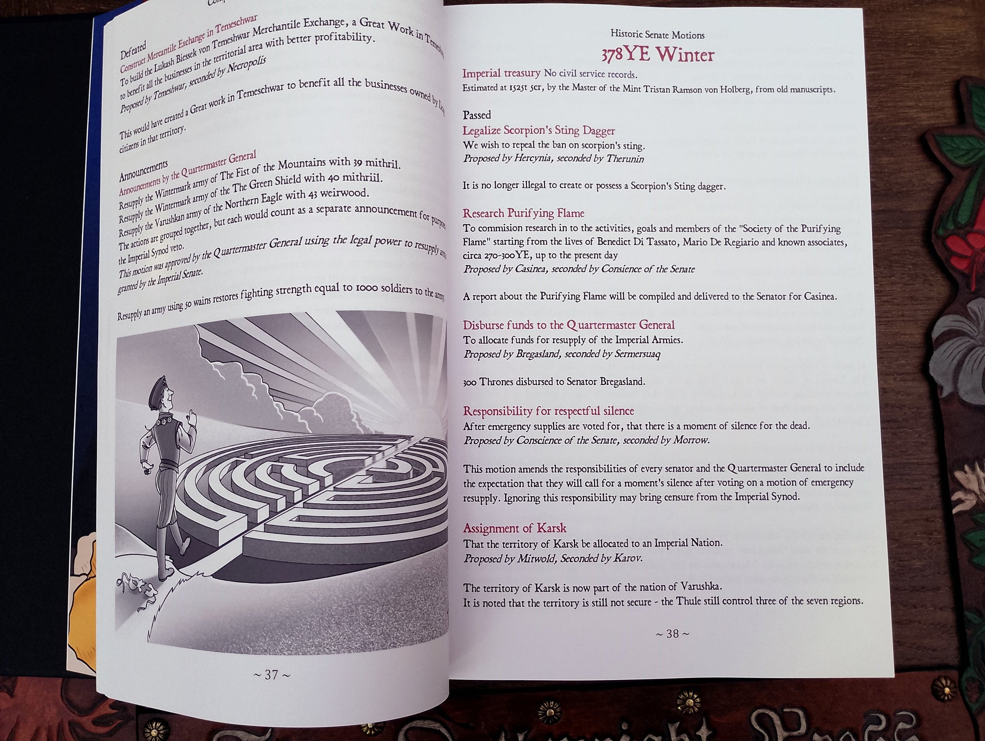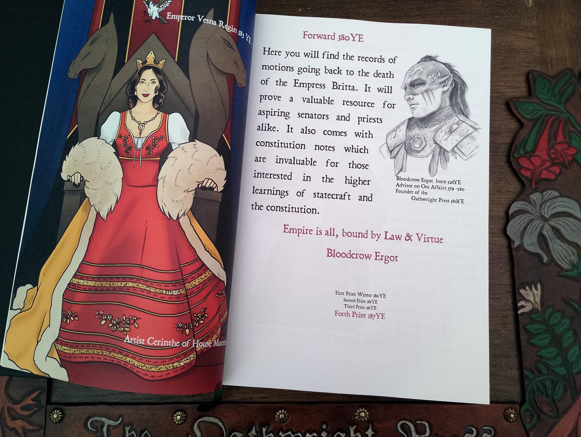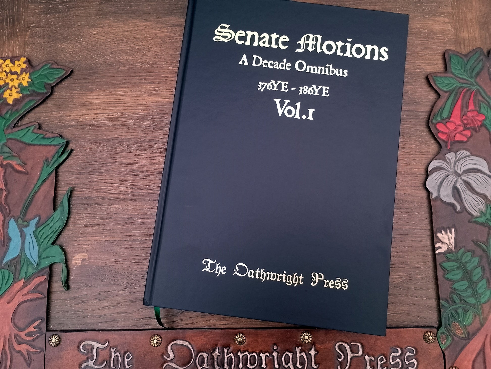 This volume presents a decade-long compilation of all motions from the Empire LRP game, spanning years 376YE to 386YE. It is elegantly bound in a black faux leather hardcover with gold embossing, featuring a dark green endpaper, high-quality 100gsm paper, and a ribbon marker for ease of reference, printed in A4.