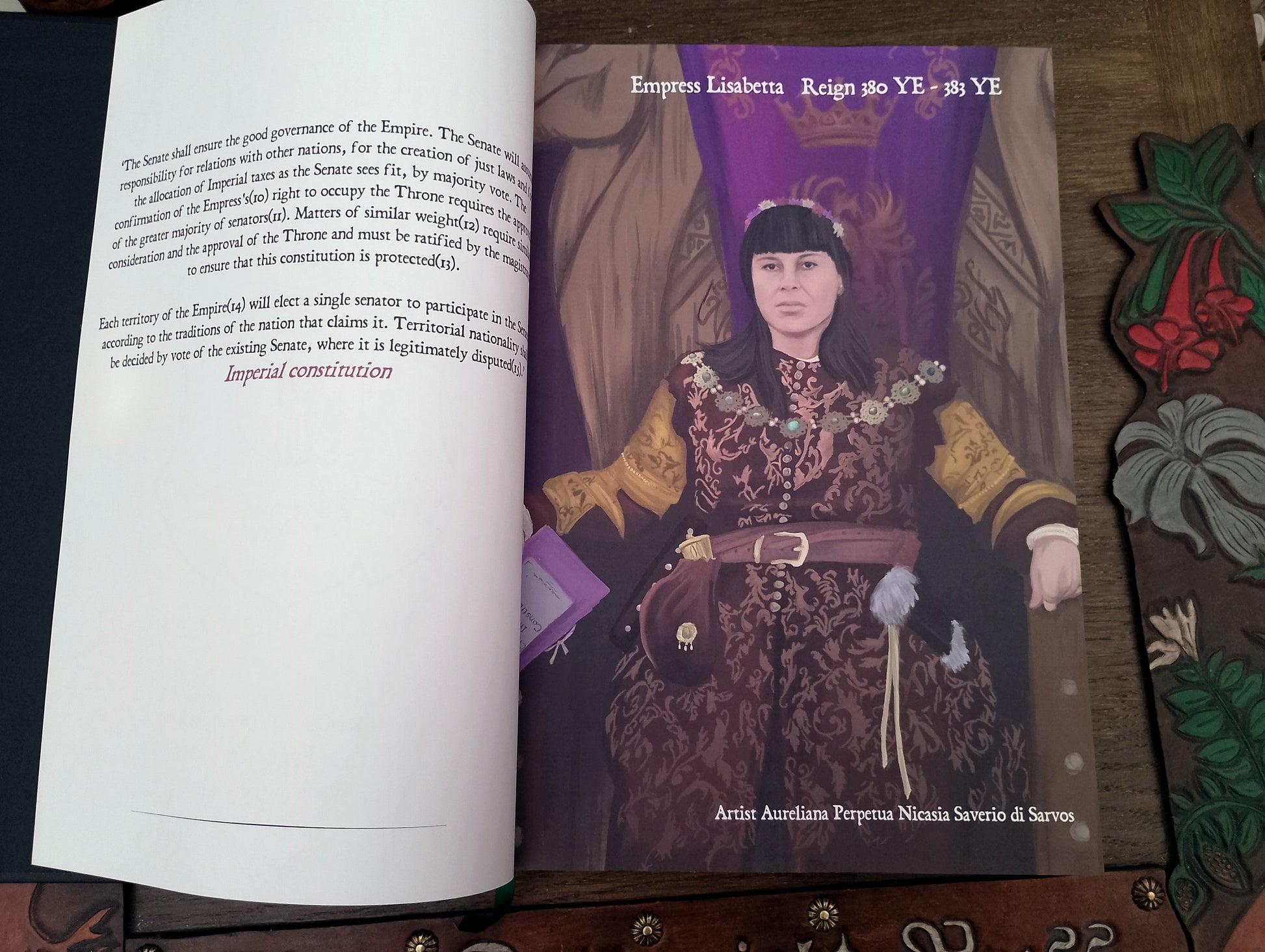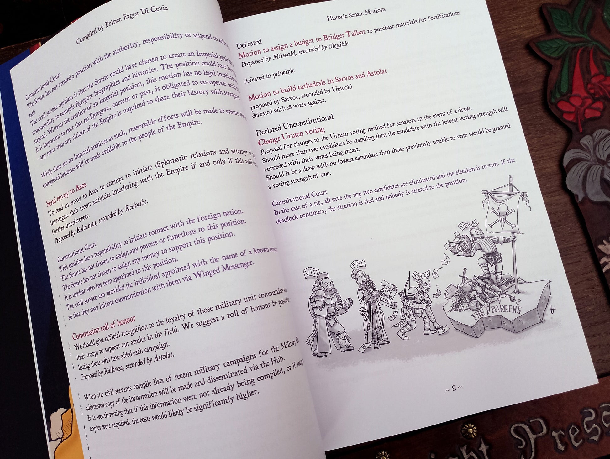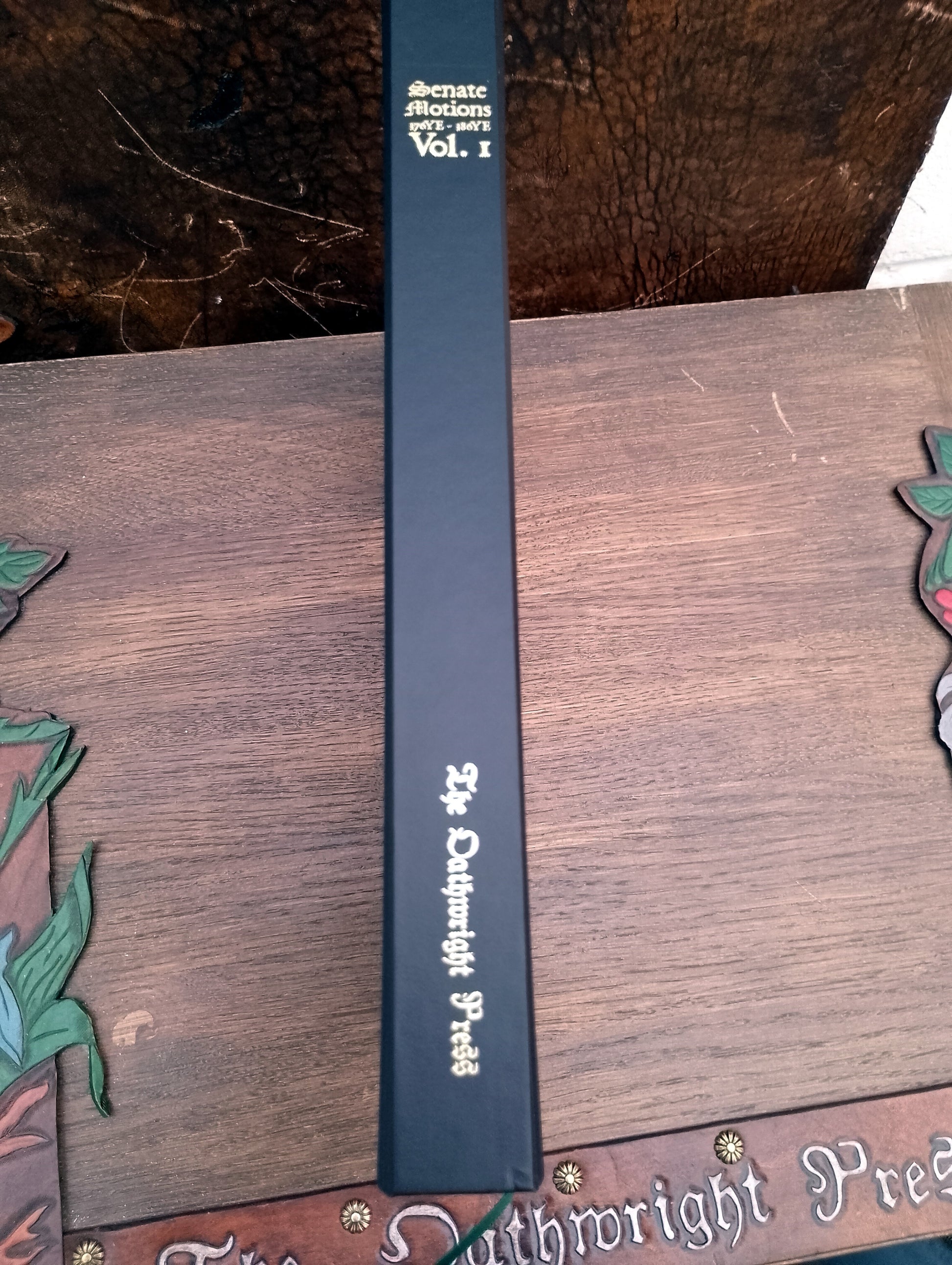 This volume presents a decade-long compilation of all motions from the Empire LRP game, spanning years 376YE to 386YE. It is elegantly bound in a black faux leather hardcover with gold embossing, featuring a dark green endpaper, high-quality 100gsm paper, and a ribbon marker for ease of reference, printed in A4.