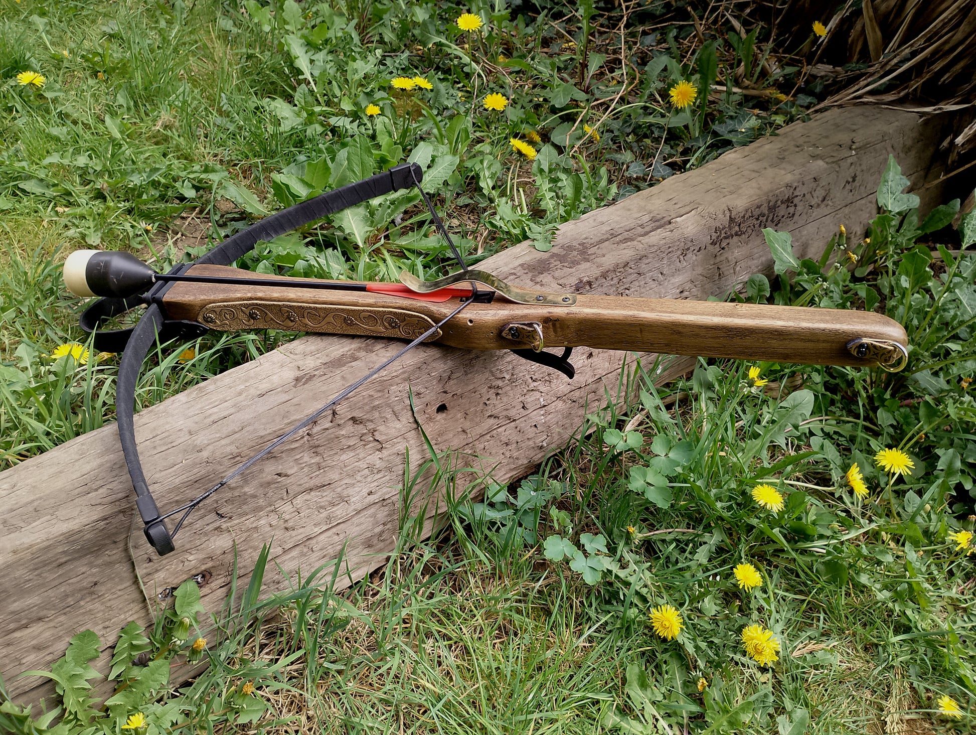 Automatic re-locking of trigger mechanism on redraw of string, Safety Trigger, and Strap hard points. Kiln dried wood for the stock and a Fiberglass prod. 1kg weight approx